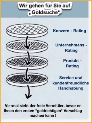 Die Vorschläge, die wir nach der individuellen Bedarfsermittlung machen, durchlaufen eine Vielzahl von feiner werdenden Sieben, ähnlich wie bei der Goldsuche. Bevor wir Ihnen einen Vorschlag machen, wurde dieser mindestens viermal gesiebt: